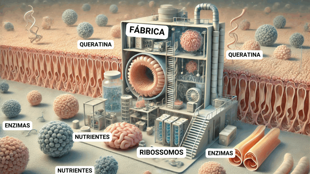 Segundo a Dra. Eneida Janiscki, a produção das proteínas estruturantes dos cabelos — como o colágeno e a queratina — pode ser comparada a uma linha de montagem em uma fábrica. “Os nutrientes que ingerimos funcionam como a matéria-prima dessa fábrica”, explica ela. “Eles entram pelo sistema digestivo e seguem para células específicas, onde são processados e transformados essas proteínas essenciais para a saúde e beleza.”